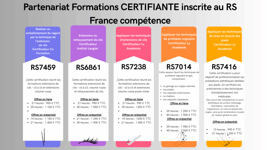 Nos formations sont éligibles aux financements La loi n° 2018-771 du 5 septembre 2018 pour la liberté de choisir son avenir professionnel prévoit dans son article 6 une obligation de certification, par un organisme tiers, des organismes réalisant des actions concourant au développement des compétences sur la base d’un référentiel national unique, s’ils veulent bénéficier de fonds publics ou mutualisés (financement par un opérateur de compétences, par la commission mentionnée à l’article L. 6323-17-6, par l’État, par les régions, par la Caisse des dépôts et consignations, par Pôle emploi ou par l’Agefiph). Lecluze julie academy jl studio beauté est certifié QUALIOPI au titre des catégories “Les actions de formation” / Certificat B02743/ Valable du 06/12/2025 au 05/12/2027 / Première émission le 06/12/2021